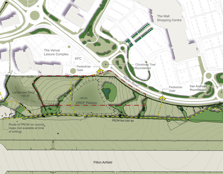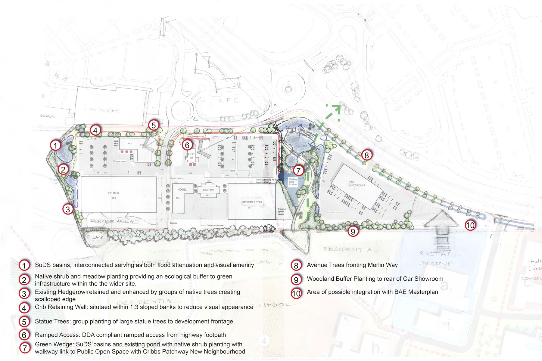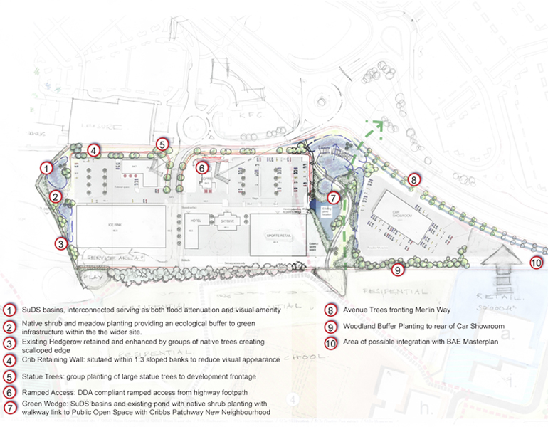 A focus of the landscape scheme was to create a green infrastructure and pedestrian movement link between the shopping centre and the proposed housing on the redeveloped Filton Airfield site. The design integrated the collection and use of all surface water in order that the water can be used as a permanent pond habitat for existing fauna. The scheme also incorporated a series of inter-linked swales and depressions to provide an attractive and functional area of open space which can also be used as an educational resource.